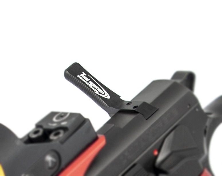 Questa leva di armamento in alluminio è progettata per pistole Tanfoglio, e si aggancia facilmente nella sede della tacca di mira a coda di rondine, senza necessità di modifiche permanenti all’arma.